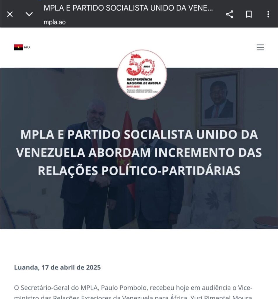 Outra imagem partilhada por Adalberto Costa Júnior refere-se a um comunicado oficial do MPLA, datado de 17 de abril de 2025, que dá conta de um encontro em Luanda entre o secretário-geral do partido no poder, Paulo Pombolo, e representantes do Partido Socialista Unido da Venezuela (PSUV).
