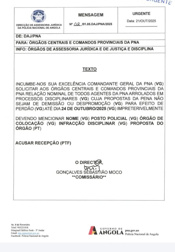 A Direcção de Assessoria Jurídica da Polícia Nacional de Angola (PNA) emitiu, nesta terça-feira, 21 de Outubro de 2025, uma directiva urgente aos órgãos centrais e comandos provinciais, solicitando a remessa de listas nominais de agentes actualmente a responder em processos disciplinares.